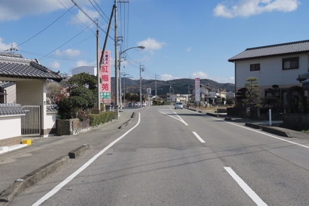 交差点手前左側に「うどん屋」さん、右側に「石材(墓石)店」さん、左奥に「農協」があります。